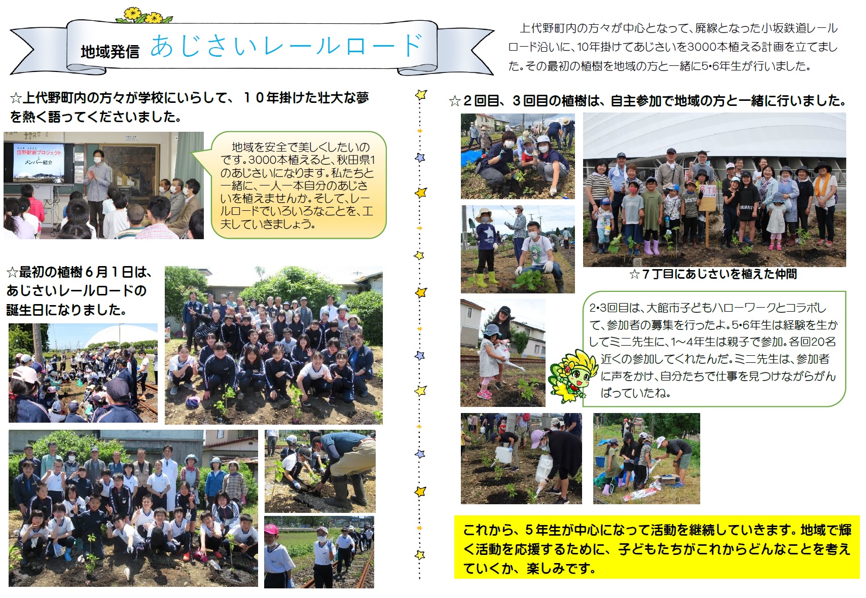 小坂鉄道沿線に、10年かけて3000本のあじさいを植えようスタートしたプロジェクト。上代野の地域の方々が中心となり、未来に向かって夢が広がっています。長木小の5・6年生も最初の植樹祭に参加し、自分のあじさいが育っています。
