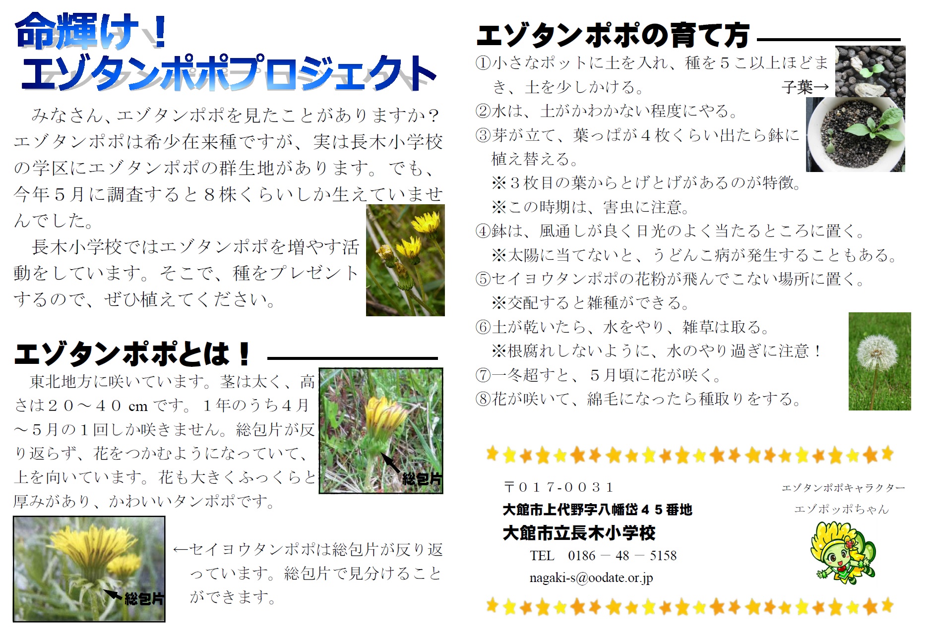 エゾタンポポは希少価値の日本タンポポで、毎年、小さな命をしっかりとつないで、春に可愛い花を咲かせます。その群生地をはじめ、私たちの町にはすてきな輝く命がたくさんあります。