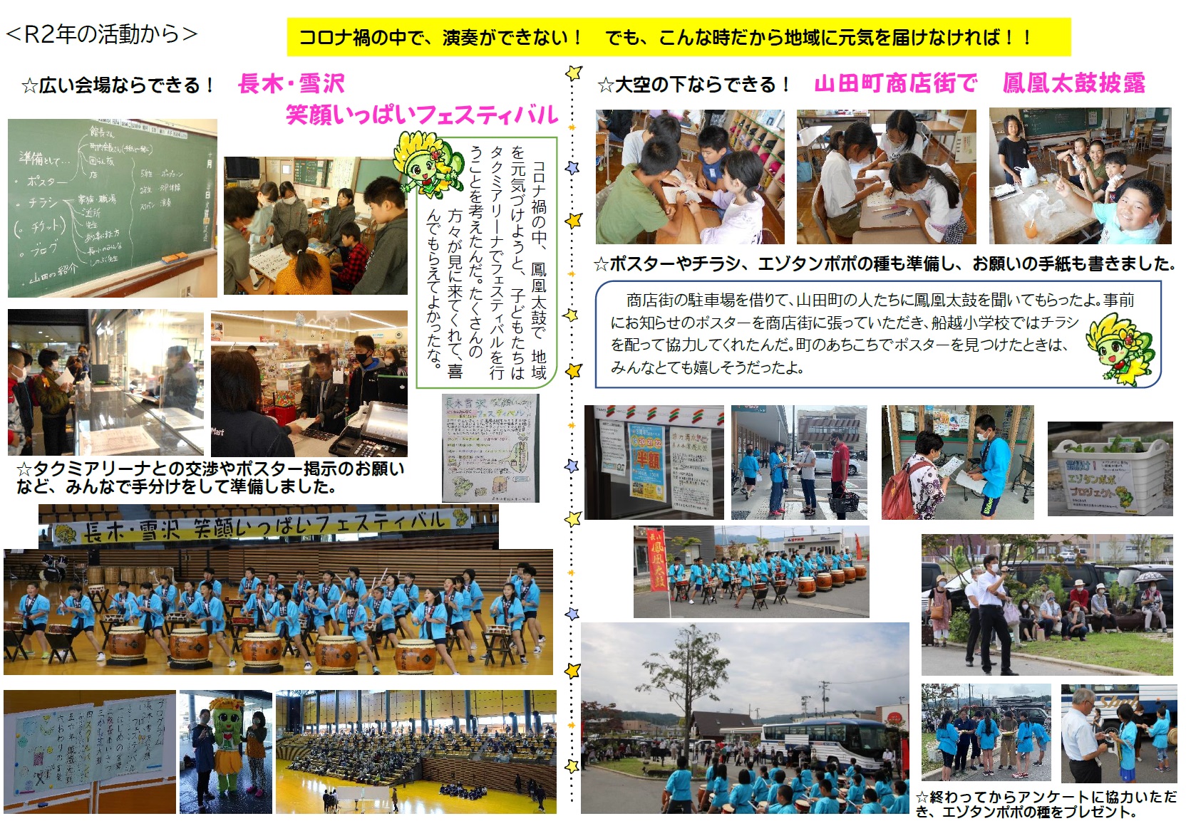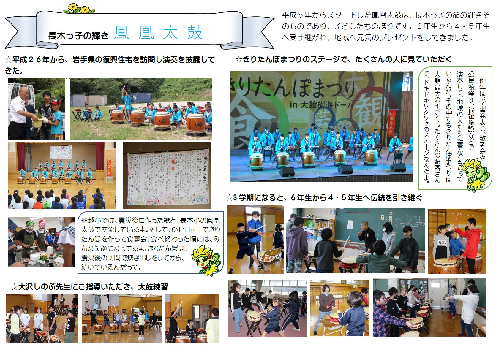 平成5年から代々受け継がれてきた鳳凰太鼓。大沢しのぶ先生に指導していただきながら、6年生が中心になってつないできました。「大地」「清流」「レインボー〜未来への架け橋〜」の3曲があります。その中でも、「レインボー」は、雪沢小と長木小を、岩手県山田町と長木小をつなぐという思いが込められています。鳳凰太鼓は、長木っ子の輝きが、一番強く感じられます。