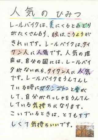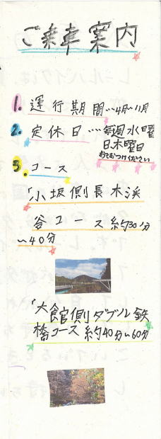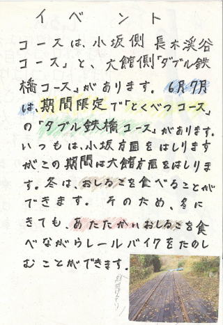 廃止された小坂鉄道の線路の再利用として行われています。自転車で、線路を走ります。春は新緑、秋の紅葉と、季節を十分感じることができます。